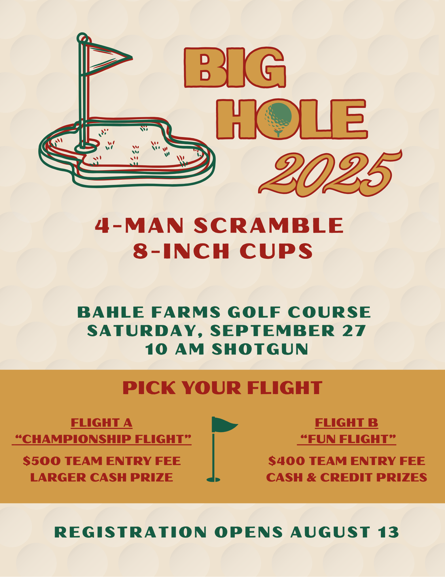 Big Hole is back for 2025! Grab your foursome and get ready for a great day of golf featuring 8 inch holes!
