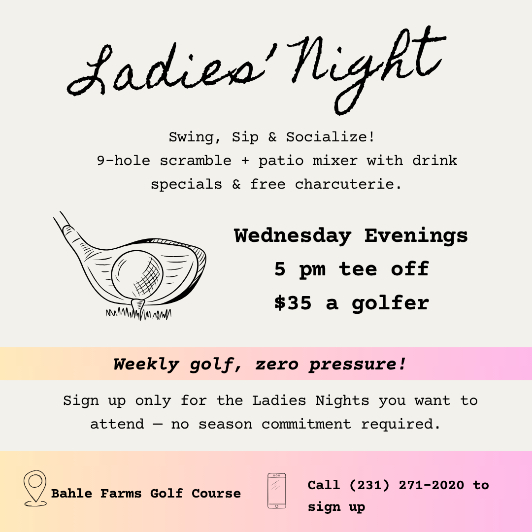 Join us for Ladies’ Night, a casual 9-hole event perfect for golfers of all levels. Whether you’re signing up with friends or coming to meet new ones, this is a fun and welcoming way to enjoy the course. After your round, relax on the patio with a drink and good company.